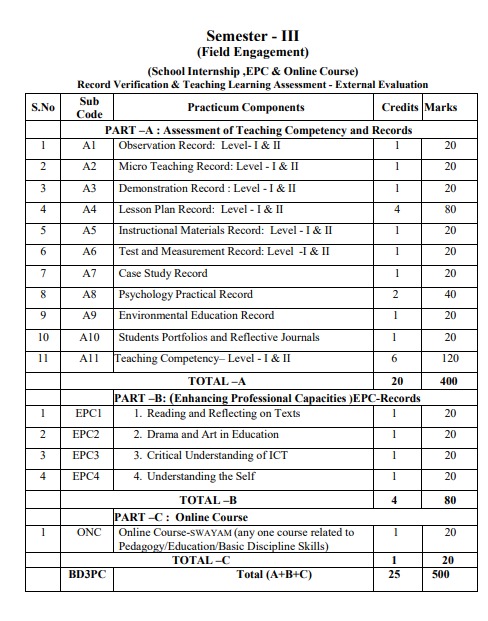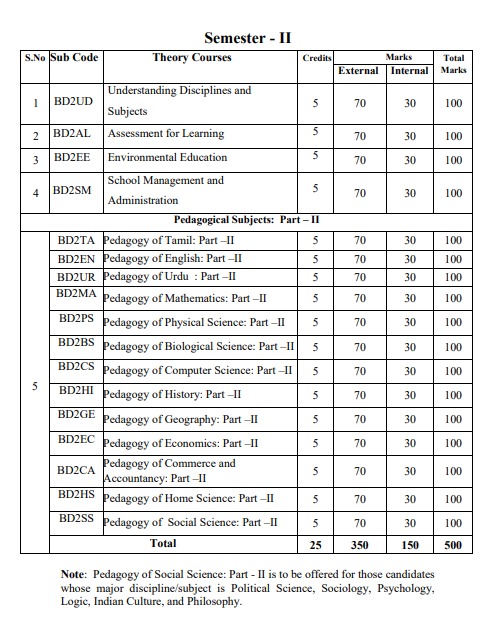 Each candidate, whose admission is approved by Tamil Nadu Teachers Education University only permitted for written and practical examinations. Candidates who have failed to satisfy the minimum attendance norms of Tamil Nadu Teachers Education University in each semester will not be permitted to appear for the written examination and or practical examinations. The term-end external examination for all semesters shall be conducted by the Tamil Nadu Teachers Education University at the end of each semester. The written examination for each theory course shall be conducted for 70 marks.